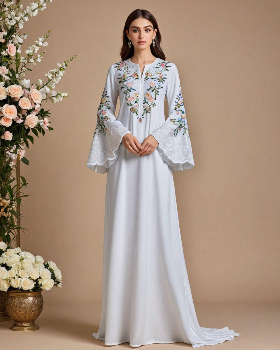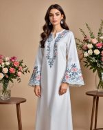 نسخة أكثر أنوثة من الجلابية المطرّزة، تتميّز بأكمام واسعة ناعمة تضيف حركة وفخامة، مع تطريز زهري متوازن يرفع القطعة لمستوى راقٍ.