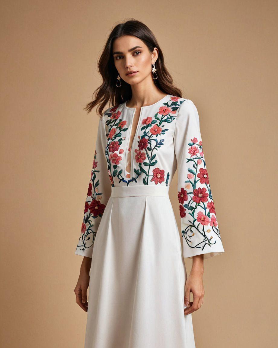 •الأكمام: واسعة (Bell Sleeves) مطرّزة