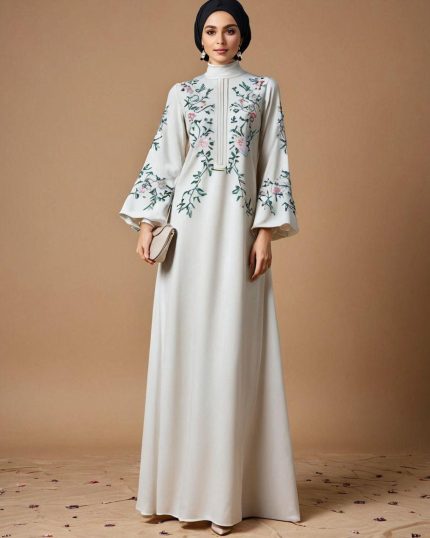 جلابية مطرّزة أبيض عاجي | جلابية فاخرة بتطريز زهري ناعم
